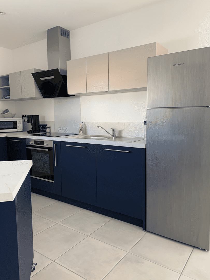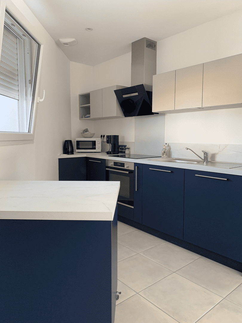 Les caissons et les meubles bas, réalisés dans un bleu profond, apportent un contraste élégant et contemporain avec les éléments hauts, qui sont d’une teinte beige. Cette combinaison de couleurs modernes crée un effet visuel apaisant et sophistiqué, tout en jouant avec la lumière naturelle pour donner une sensation d’espace plus ouvert.
