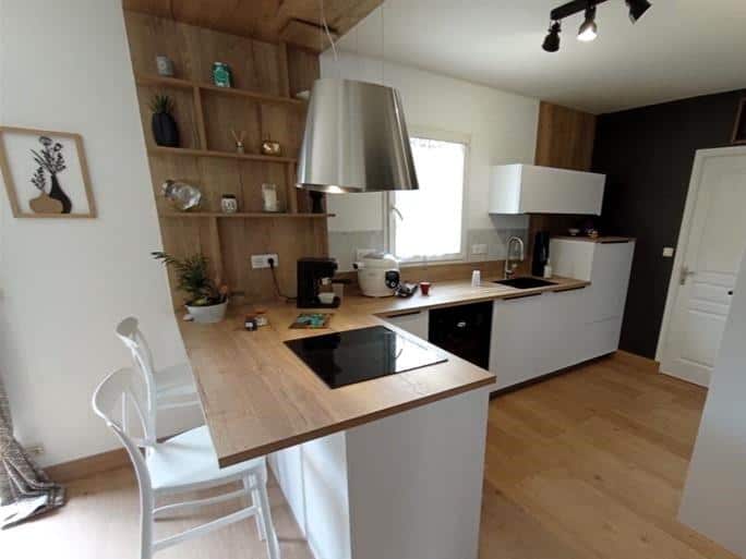 Le prolongement du plan de travail en bois vers le plafond, par le biais de cette bibliothèque ouverte intégrée, offre un aspect moderne, chaleureux et naturel à la pièce. Ce choix renforce l’impression de verticalité et permet de structurer visuellement l’espace. La texture et la chaleur du bois apportent un équilibre subtil face aux lignes épurées et modernes des autres éléments de la cuisine.