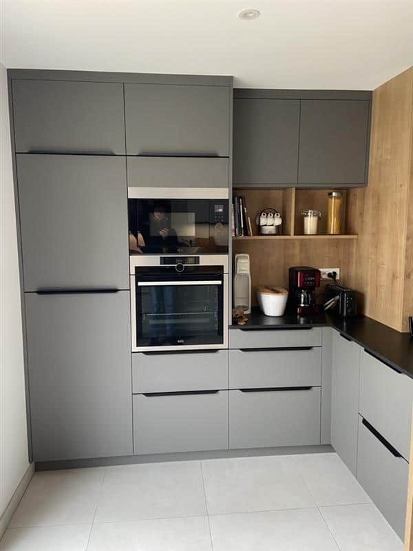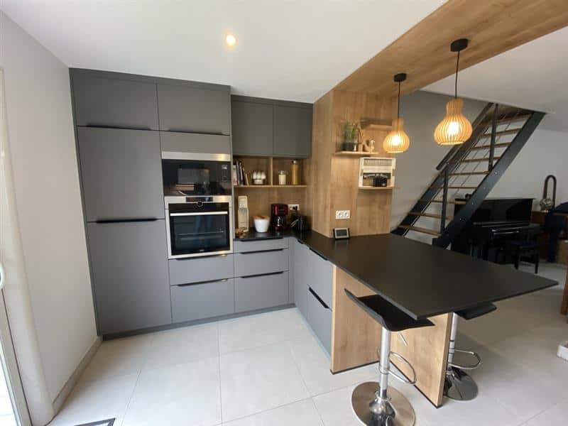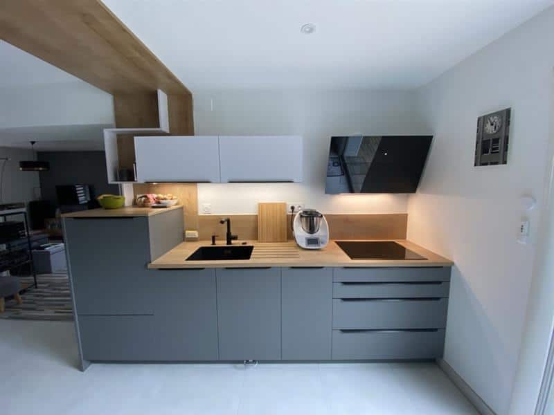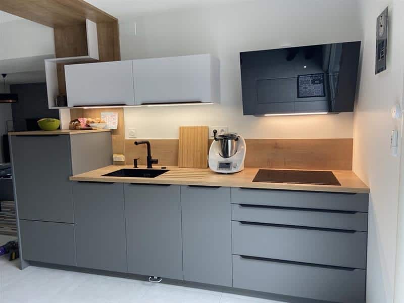 Le premier détail marquant est le retour casquette en bois qui délimite les espaces. Ce retour, au-dessus de la cuisine, crée une transition fluide entre la cuisine et le reste de la pièce à vivre, tout en conservant une unité visuelle. Le bois, matériau chaleureux par excellence, apporte une touche naturelle qui contraste agréablement avec les éléments plus contemporains de la cuisine. L’étagère en prolongement du meuble haut est un autre point de finesse dans cette conception. Non seulement elle offre un espace de rangement supplémentaire, mais elle contribue également à alléger visuellement l’ensemble. Le fait que cette étagère soit ouverte permet de ranger et d’exposer certains objets décoratifs ou ustensiles de cuisine, ce qui personnalise l’espace tout en restant fonctionnel. La cuisine présente un agencement bicolore qui attire immédiatement l’œil. Le contraste entre les façades blanches des éléments hauts, et le gris anthracite du reste des meubles, crée un effet visuel intéressant. Cette dualité permet d’alléger la partie supérieure de la cuisine tout en apportant de la profondeur en bas. Cette combinaison de couleurs est à la fois moderne et intemporelle, parfaitement adaptée à un intérieur contemporain.