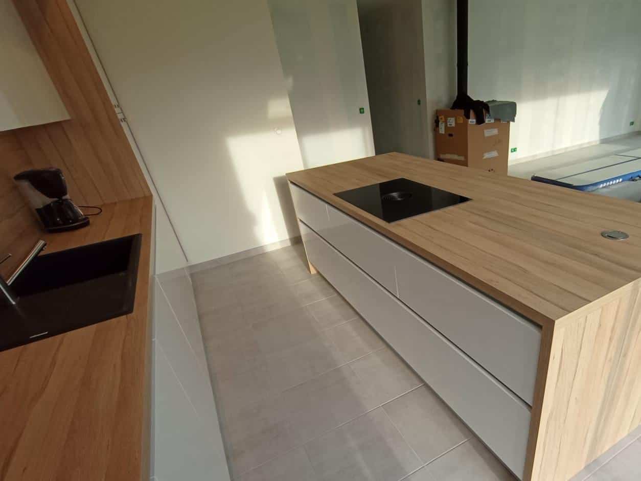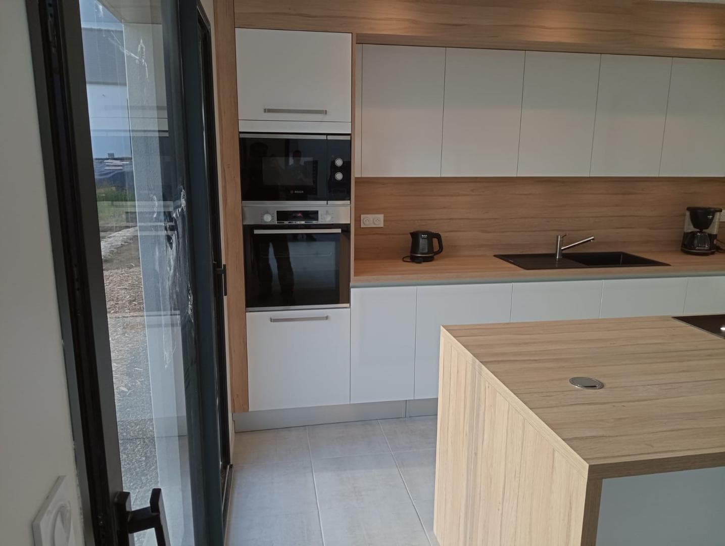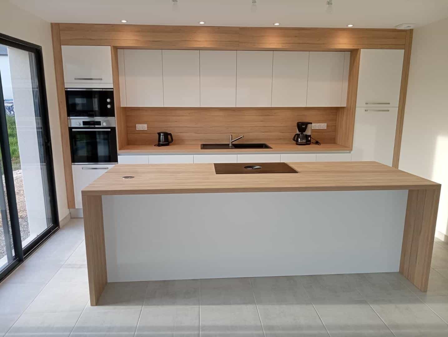 Cette cuisine moderne met en avant un îlot central à la fois élégant et pratique, véritable pièce maîtresse de l’agencement. Avec des finitions en bois clair et des lignes épurées, elle offre un espace à la fois convivial et fonctionnel, parfaitement adapté aux besoins du quotidien.