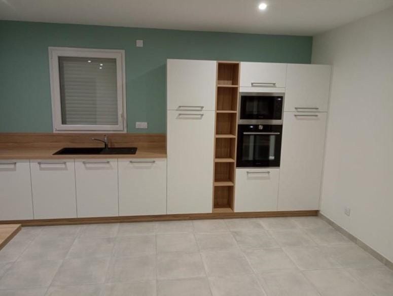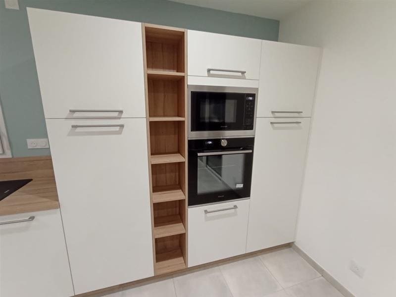 - Colonnes intégrées : Le four et le micro-ondes sont parfaitement intégrés dans des colonnes verticales, libérant ainsi de l’espace sur le plan de travail et apportant une ergonomie idéale pour la cuisson au quotidien.