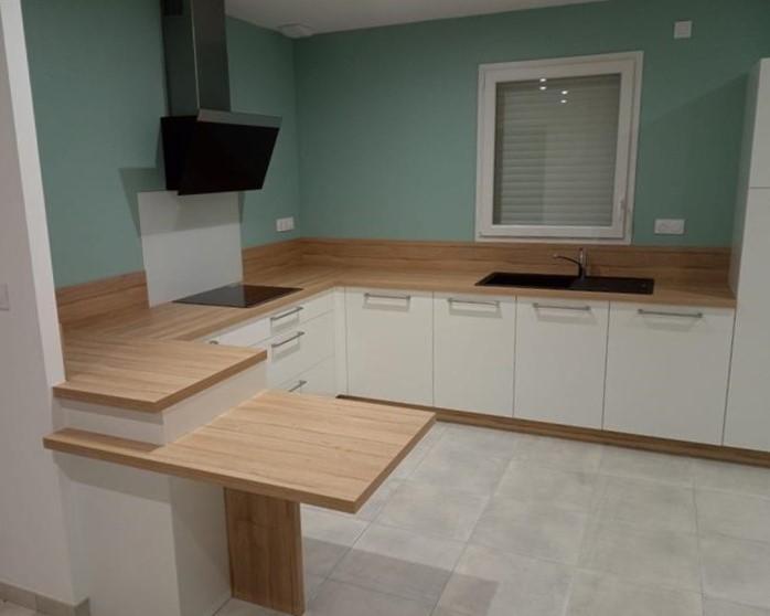 - Plan de travail ton bois naturel : Le plan de travail d’aspect bois apporte une touche chaleureuse et authentique à cette cuisine moderne. Le contraste avec les meubles blancs souligne une esthétique élégante et lumineuse. Ce matériau ajoute une sensation de confort à l’espace, tout en étant facile à entretenir.