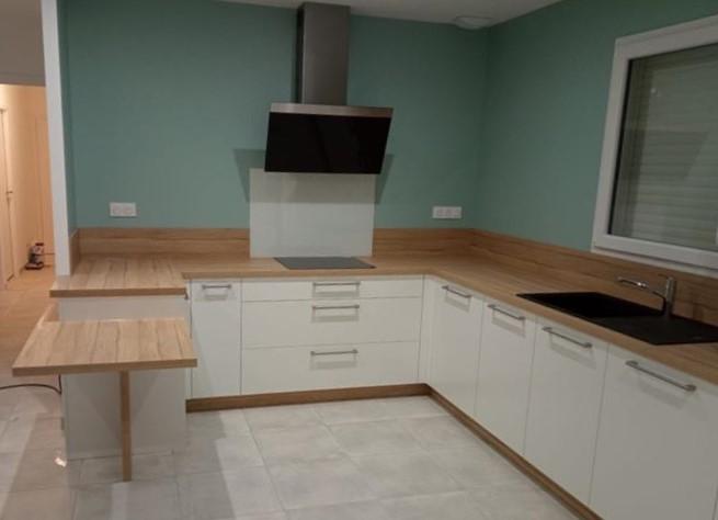 - Meubles blancs : Les façades des meubles de cuisine en finition blanche offrent un style intemporel et contribue à agrandir visuellement la pièce.