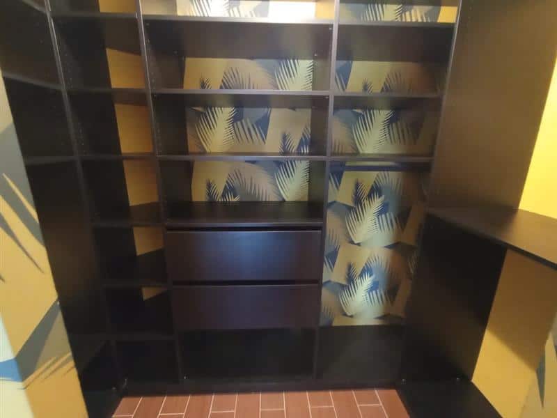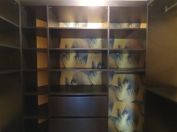 Les tiroirs intégrés sont idéaux pour ranger les articles plus petits ou délicats, tandis que les nombreuses étagères permettent de séparer les vêtements par type ou par saison. L’utilisation de finitions sombres, en harmonie avec le papier peint aux motifs audacieux, confère à ce dressing un style sophistiqué et contemporain, parfait pour une chambre parentale. Il s’agit d’un aménagement sur-mesure, pensé pour allier esthétisme et fonctionnalité, tout en créant un espace intime et personnalisé.