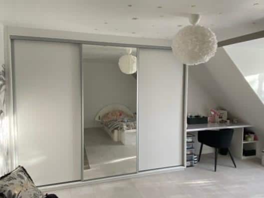 Ce dressing linéaire à portes coulissantes, situé dans une chambre d’adolescent, mise sur une esthétique minimaliste et moderne tout en étant extrêmement pratique. Les portes coulissantes offrent un gain de place considérable, particulièrement utile dans une chambre d’ado où chaque centimètre compte. Leur finition blanche, associée à une porte miroir centrale, apporte une sensation de luminosité et d’espace dans la pièce, tout en permettant une touche de style très appréciée.