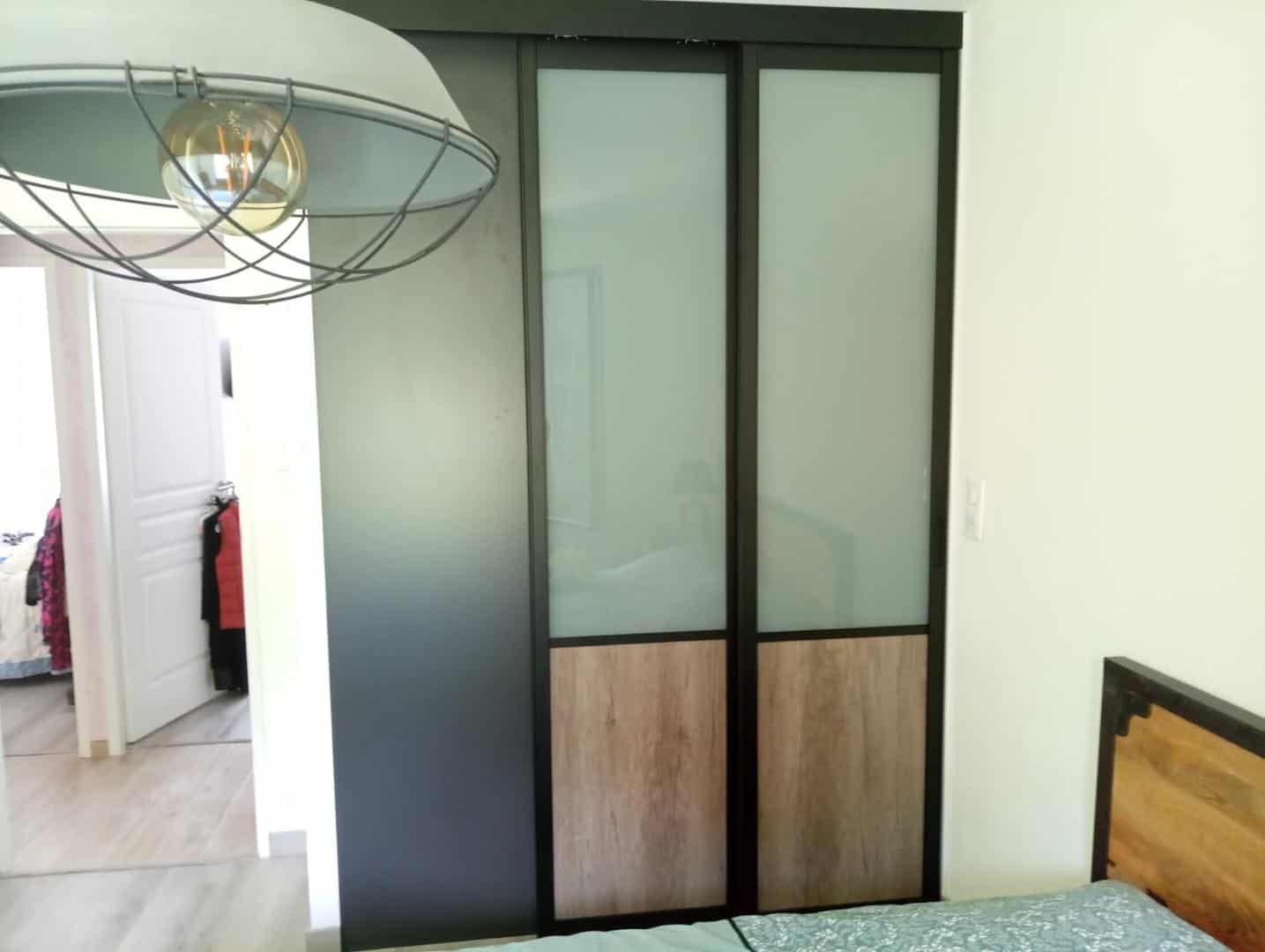 Un dressing fonctionnel, élégant et moderne, conçu avec des portes coulissantes suspendues. Une solution innovante et esthétique adaptée au retour de cloison étroit. Le design minimaliste, combinant des panneaux vitrés et des touches de bois, permet d’optimiser l’espace tout en créant une atmosphère chaleureuse et accueillante.