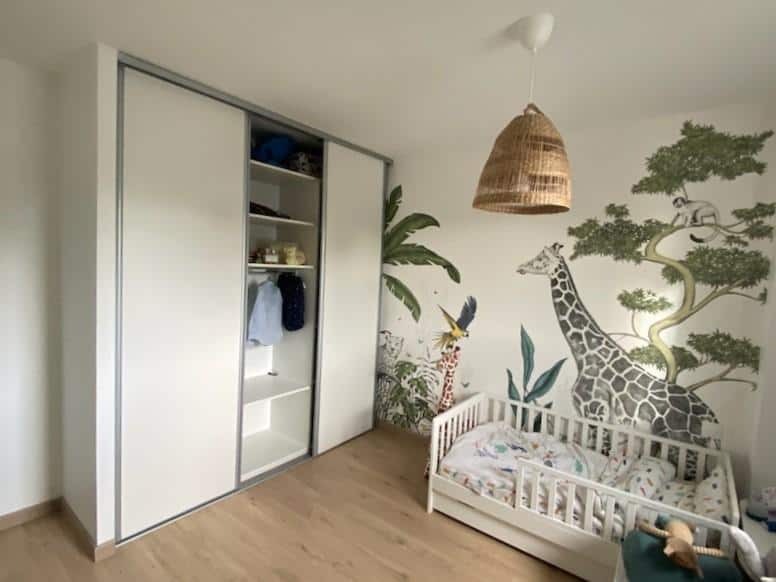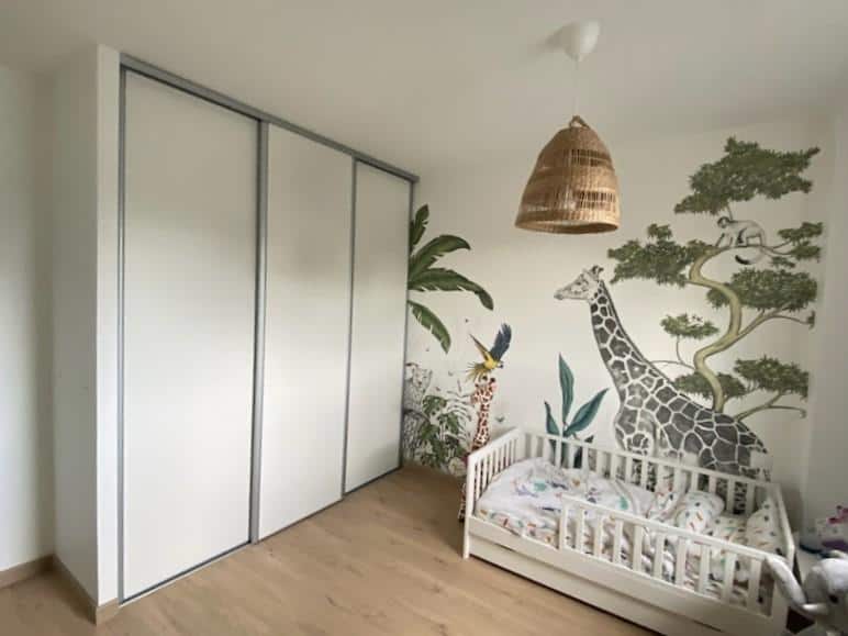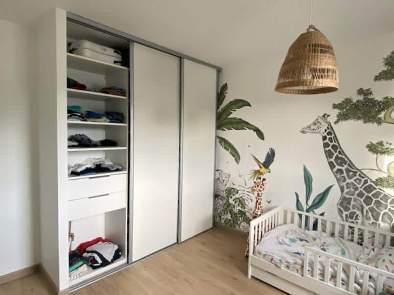 L’aspect esthétique n’est pas en reste : le design épuré du dressing se marie harmonieusement avec la décoration murale , créant une atmosphère ludique et apaisante. Cette association renforce l’idée d’une chambre à la fois fonctionnelle et joyeuse, idéale pour stimuler l’imagination des enfants.