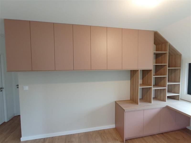 Ce bureau sur mesure, situé face à une large fenêtre donnant sur la nature, a été conçu pour allier fonctionnalité et esthétisme. Idéal pour créer un espace de travail inspirant et lumineux, cet aménagement optimise chaque recoin de la pièce. Les placards suspendus offrent de généreux espaces de rangement, tandis que les étagères, intégrées de manière astucieuse dans la pente du toit, ajoutent du caractère tout en permettant de ranger efficacement livres et accessoires.