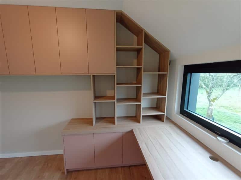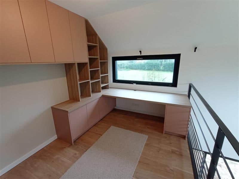 Cet aménagement de bureau sur mesure est donc la solution parfaite pour ceux qui souhaitent un espace de travail confortable, organisé et en harmonie avec la nature environnante. Il est l’exemple de ce que peut offrir un expert en agencement en termes d’optimisation des espaces et d’intégration esthétique dans l’architecture existante.