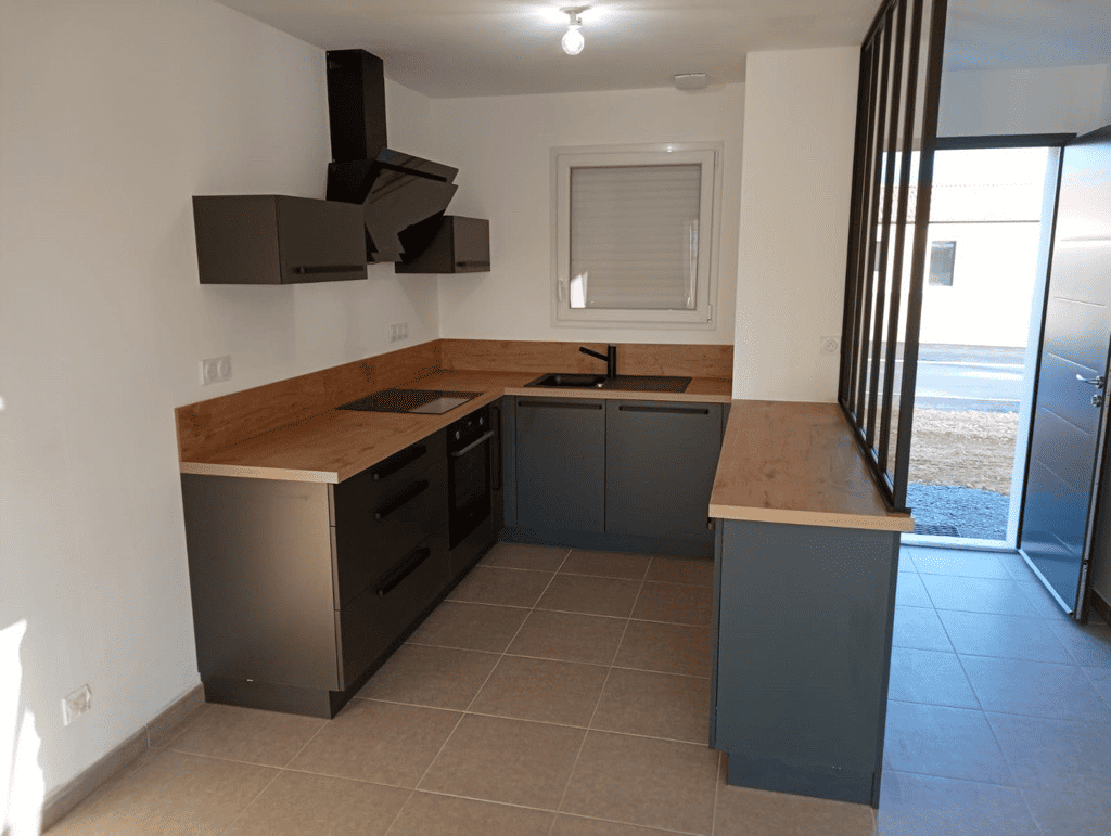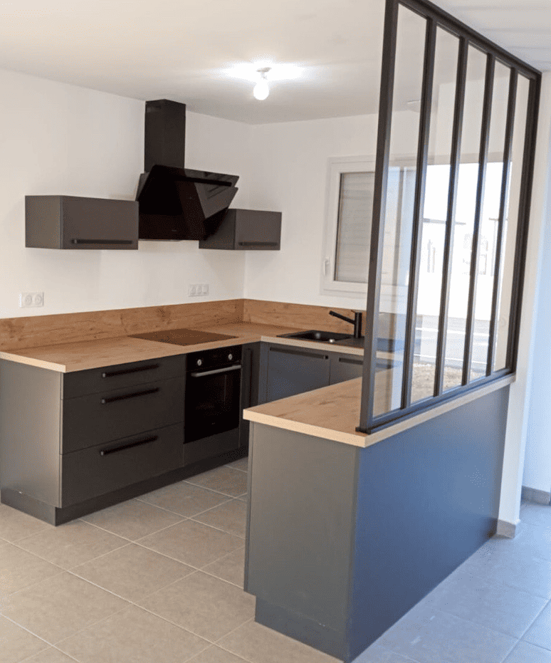 Enfin, au niveau du design, cette verrière s’intègre harmonieusement dans une cuisine moderne grâce à ses lignes fines et à son cadre métallique noir, apportant une touche industrielle chic. Elle met en valeur le plan de travail en bois et les meubles de cuisine anthracite, tout en accentuant la modernité et la fonctionnalité de l’ensemble. Ce type de verrière est idéal pour ceux qui recherchent une solution d’agencement à la fois esthétique, lumineuse et parfaitement adaptée aux intérieurs contemporains.