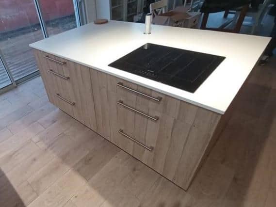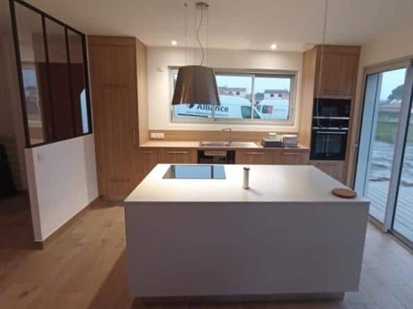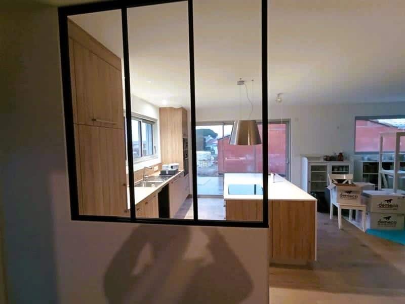 Cette verrière, subtilement intégrée dans l’aménagement de cette cuisine, présente de nombreux avantages en termes de luminosité et de circulation de la lumière entre la cuisine, le salon et l’entrée de la maison.