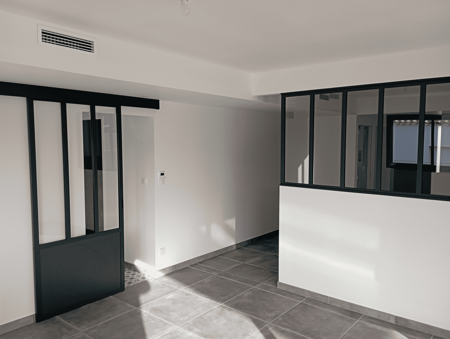 Dans un contexte professionnel, cette porte coulissante et ces verrières permettent de structurer les espaces de manière fonctionnelle. La porte coulissante est un atout pour limiter le passage du bruit tout en conservant un visuel dégagé. Pour un bureau ou une salle de réunion, cette option est idéale pour concilier intimité et collaboration. Dans une habitation, ce type de cloison permet de séparer des espaces sans couper totalement la communication visuelle, comme entre une cuisine et un salon, tout en offrant une protection contre les bruits de cuisine ou d’activités.