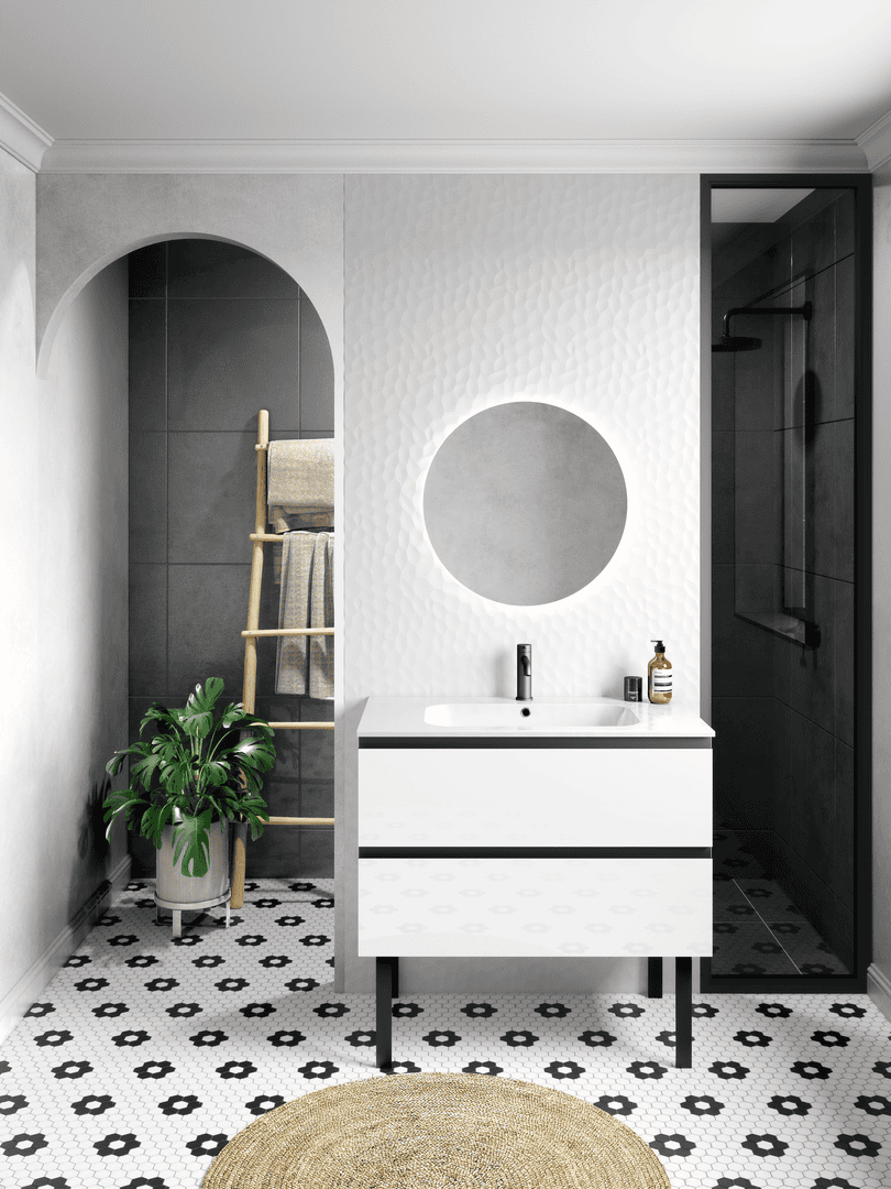 Le miroir rétroéclairé, encadré par un design géométrique circulaire, illumine la pièce d’une douce lumière diffuse, créant une atmosphère apaisante, parfaite pour les routines matinales ou les moments de détente. Le jeu de texture sur les murs, avec des carreaux texturés blancs qui contrastent élégamment avec les carreaux noirs de la douche, ajoute de la profondeur à l’espace sans surcharger le regard. La disposition ergonomique de la douche à l’italienne optimise l’espace, tout en offrant une expérience de douche luxueuse.