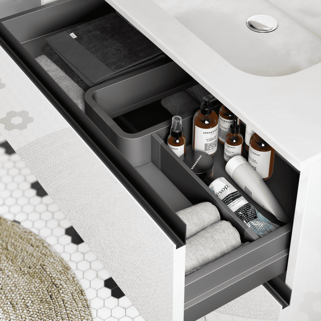 Le meuble sous-vasque, suspendu avec ses deux tiroirs en finition blanc brillant, est une pièce centrale qui combine un design épuré avec une grande capacité de rangement. Les tiroirs, organisés avec des compartiments pratiques, permettent de garder les essentiels de la salle de bain à portée de main, tout en maximisant l’espace. Le plan vasque en solid surface ajoute une touche de raffinement, offrant une surface lisse et résistante aux éclaboussures.
