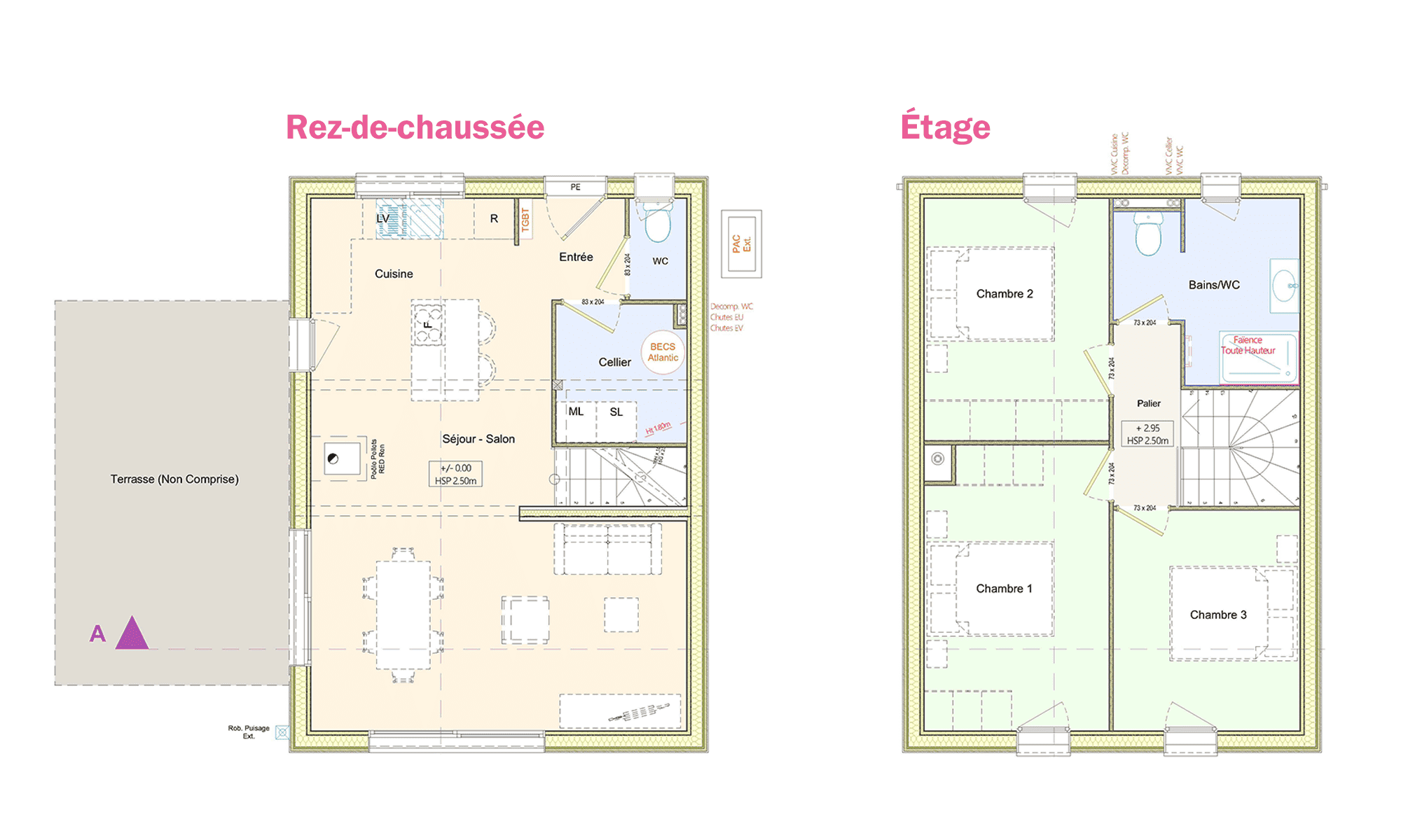 L’inspiration SOFT 6 est un modèle à étage, d’une surface habitable de 80 m². Elle comprend 3 chambres de 9 m² à 11m². La pièce de vie d’environ 33 m² se compose d’une cuisine ouverte sur un salon/séjour.
