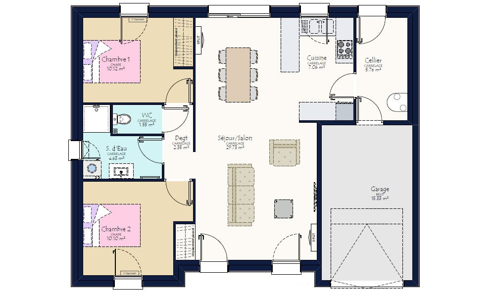 L’inspiration CATALOGUE #1 est un modèle plain-pied avec garage, d’une surface habitable de près de 71 m². Elle comprend 2 chambres de plus de 10 m² chacune. La pièce de vie d’environ 36 m² se compose d’une cuisine ouverte sur un séjour/salon.