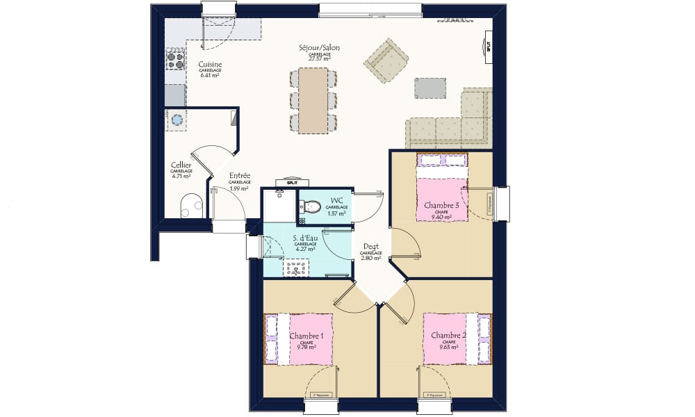 L’inspiration CATALOGUE #4 est un modèle plain-pied, d’une surface habitable de près de 77 m². Elle comprend 3 chambres de plus de 9 m². La pièce de vie d’environ 33 m² se compose d’une cuisine ouverte sur un séjour/salon.