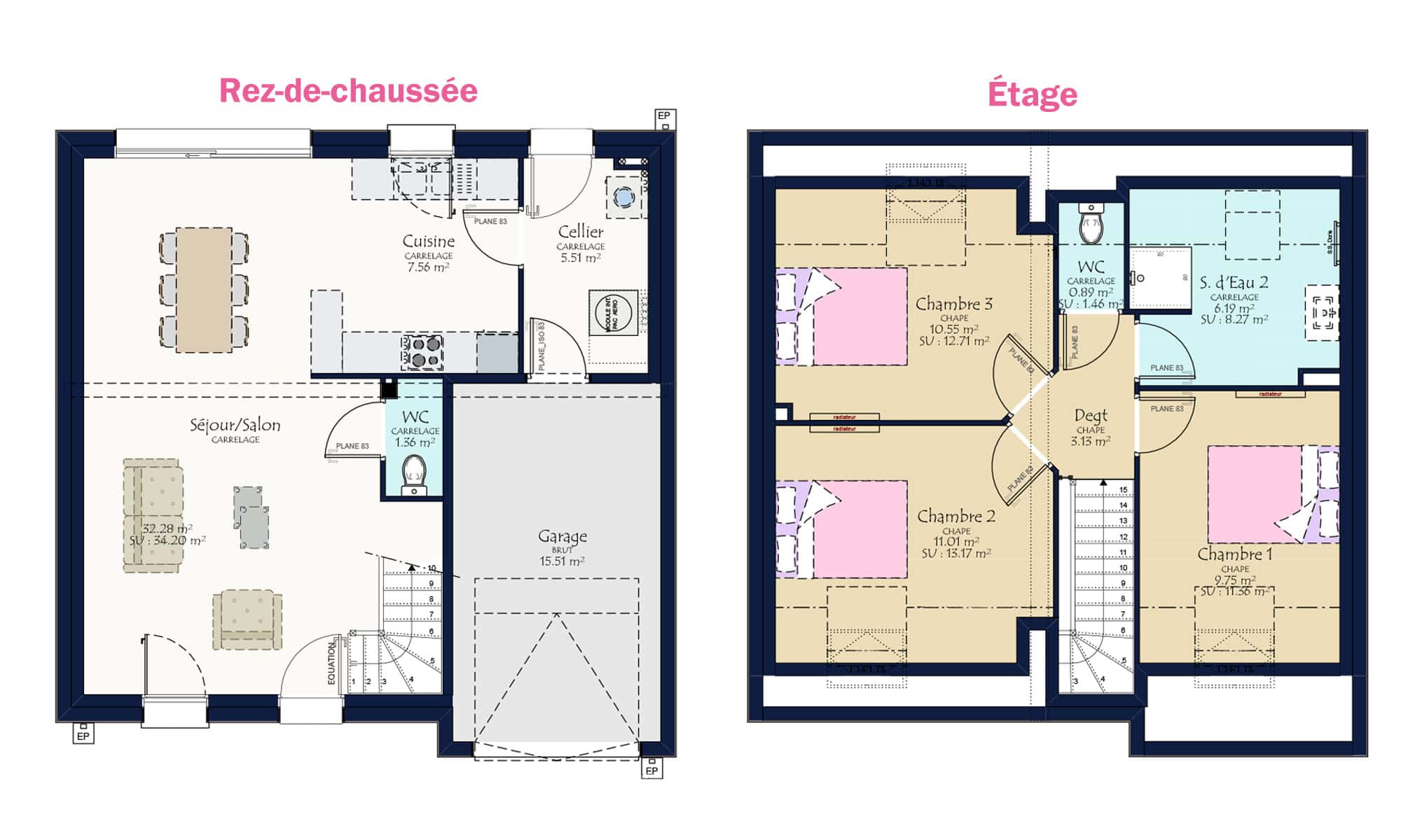 L’inspiration ECLIPSE est un modèle à étage, d’une surface habitable de plus de 88 m². Elle comprend 3 chambres de près de 10 m² environ. La pièce de vie de près de 40 m² se compose d’une cuisine ouverte sur un salon/séjour. Le cellier permet un accès direct entre la maison et le garage attenant.