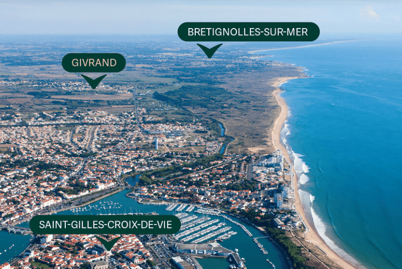 Située à Givrand, à proximité de Saint Gilles Croix de Vie, cette maison contemporaine de plain-pied avec une couverture tuile bénéficie d’une belle luminosité et d’un jardin et 274m²