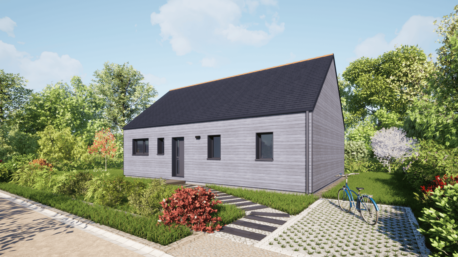 A MESANGER sur un terrain de 765 m², Alliance Construction vous propose de réaliser votre projet de construction de maison individuelle en ossature bois aux matériaux biosourcés d’une surface de 80 m² habitables avec 3 chambres, à partir de 253729€*