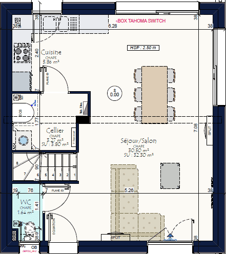 Une pièce à vivre avec cuisine ouverte sur salon / salle à manger, un cellier et un wc séparé.