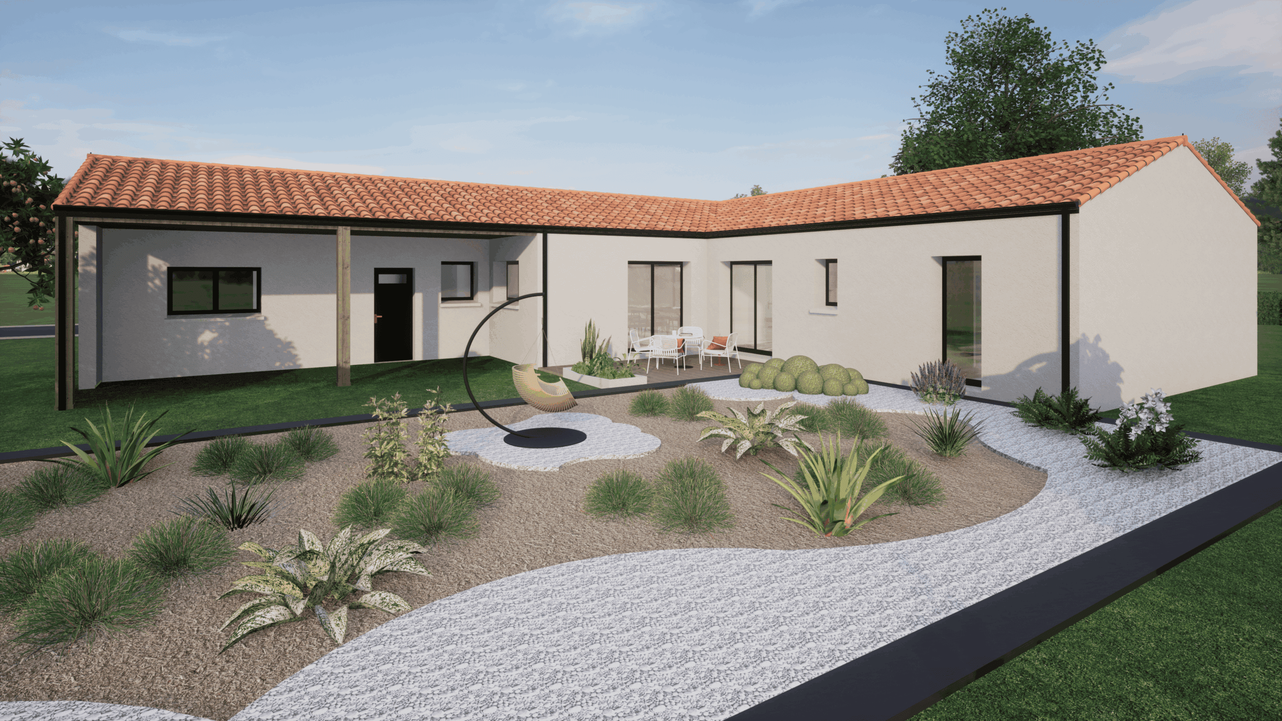 Cette maison design de plain-pied avec une couverture tuile bénéficie d’une belle luminosité et d’un jardin plat de 427m²