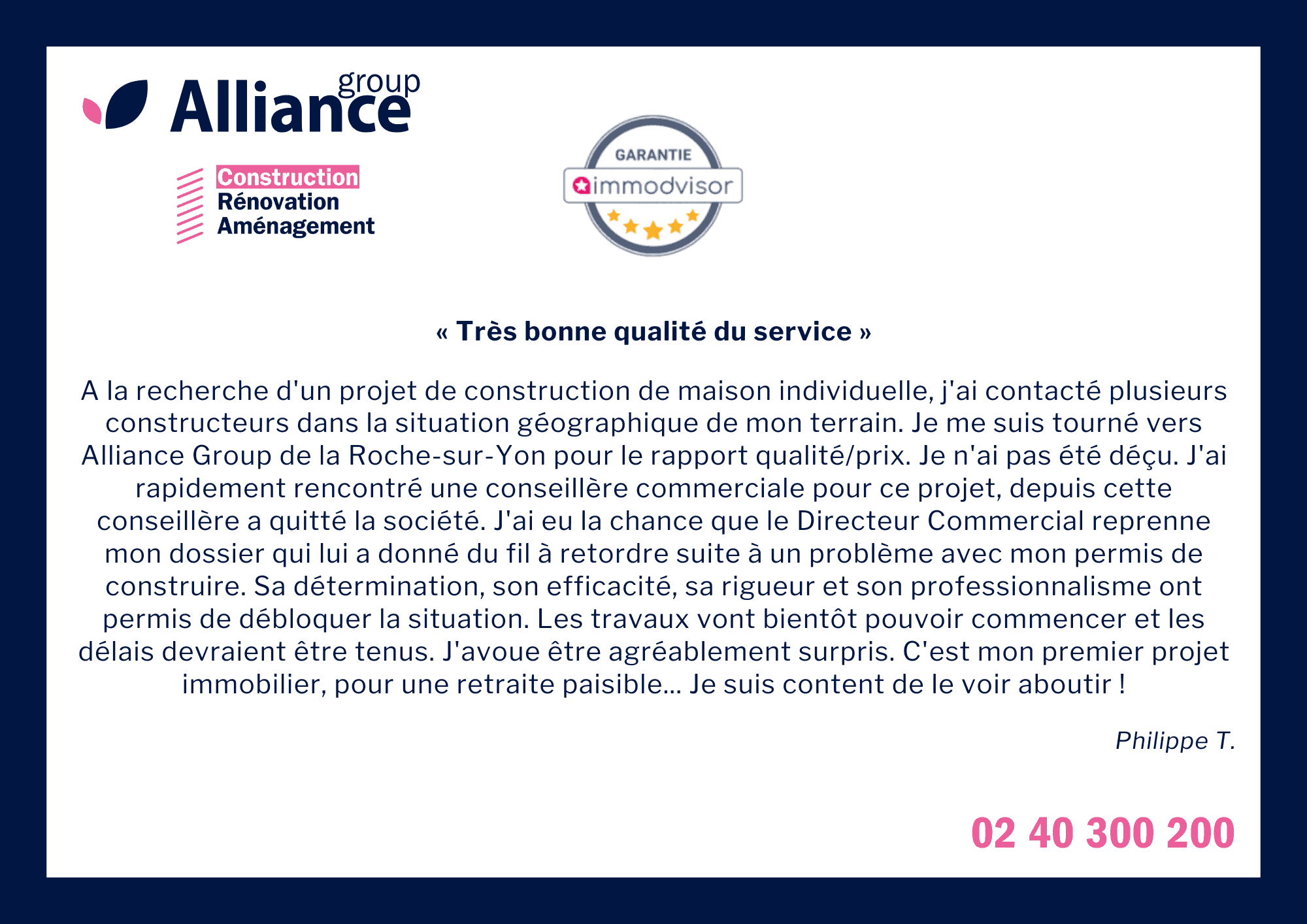 Coût de construction indicatif d’un projet de maison individuelle soumis au contrat protecteur du Code de la construction et de l’habitation (garanties financières et techniques du constructeur incluses). Voir détails en agence. Visuels non-contractuels. Prix à ajuster après visite terrain et selon vos choix définitifs. Hors droits de mutation, taxes locales, frais de raccordement. Terrain sélectionné auprès de partenaires fonciers pour la construction d’une maison neuve par ALLIANCE CONSTRUCTION (non mandatée pour réaliser la vente du terrain), sous réserve de disponibilité.