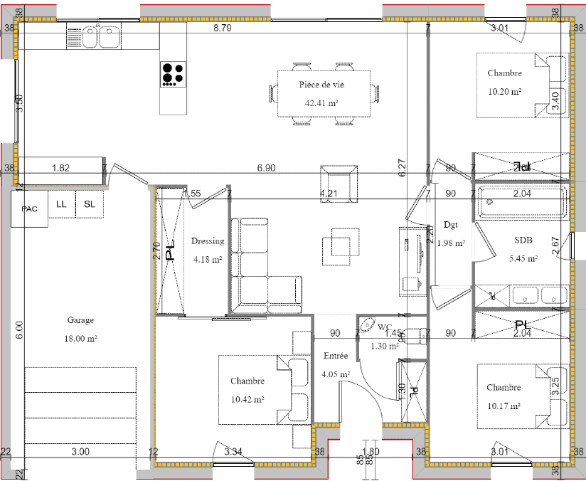 Offrez-vous cette charmante maison de 90 m² + 18 m² de garage ! Cette maison conçue de plain-pied vous apportera confort et convivialité. Elle comprend : – un séjour de plus de 42 m² bardé de grandes ouvertures, il vous offrira beaucoup de luminosité et un magnifique panorama sur l’extérieur. Sa cuisine ouverte sur la salle à manger et le salon vous permettra de recevoir famille et amis dans un esprit convivial. 3 Chambres de plus de 10 m² avec espace placard (dont une avec dressing) – Une salle de bains (espace suffisant pour une baignoire et une double vasque). Une entrée avec espace placard et wc séparés. Evolutive, nous adapterons cette maison selon vos besoins.