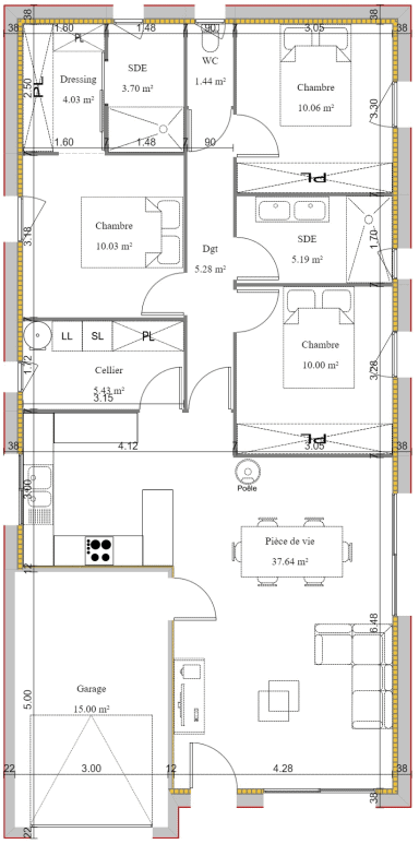 – Un espace cuisine / salon / salle à manger de 37m² dessiné en « L » afin de donner une véritable identité à chaque pièce.