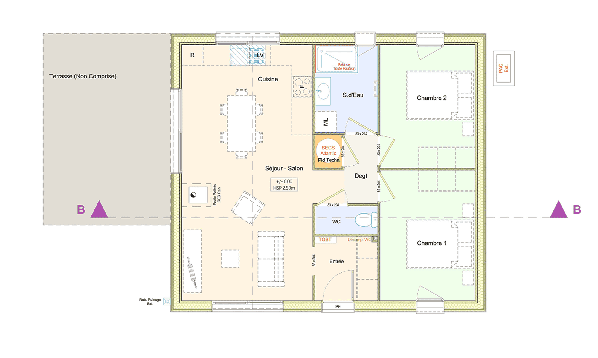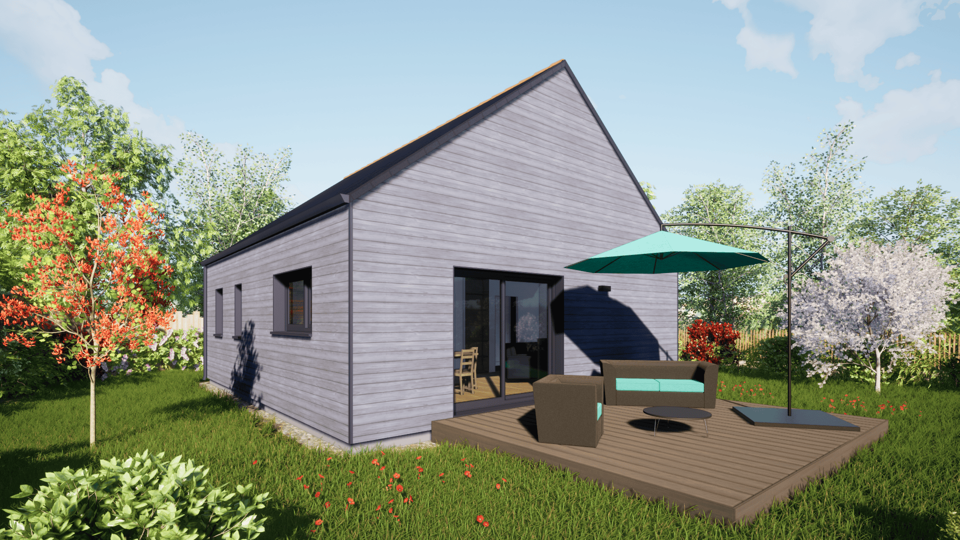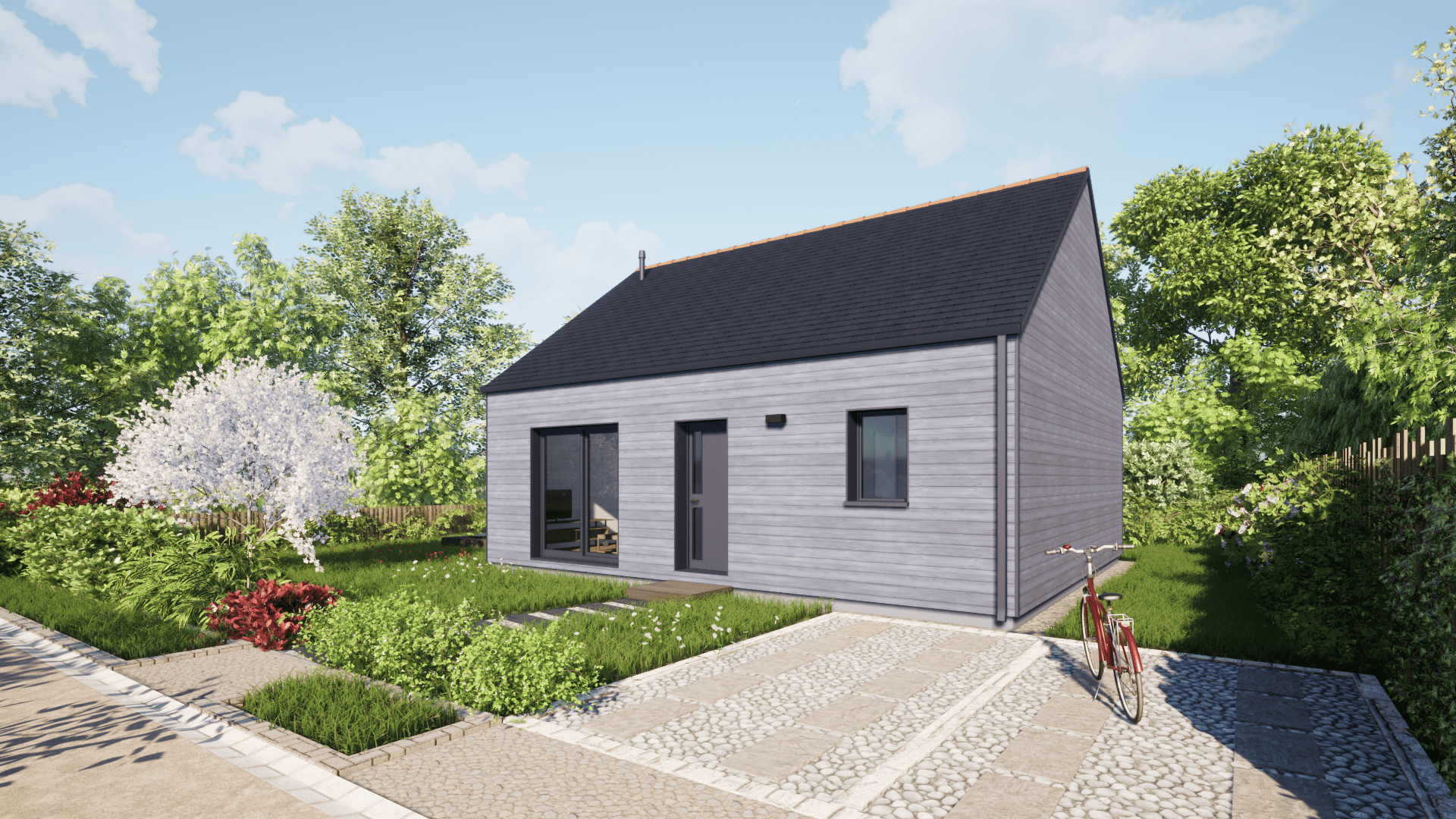A TEILLE sur un terrain de 255 m², Alliance Construction vous propose de réaliser votre projet de construction de maison individuelle en ossature bois aux matériaux biosourcés d’une surface de 60 m² habitables avec 2 chambres, à partir de 172059€*.