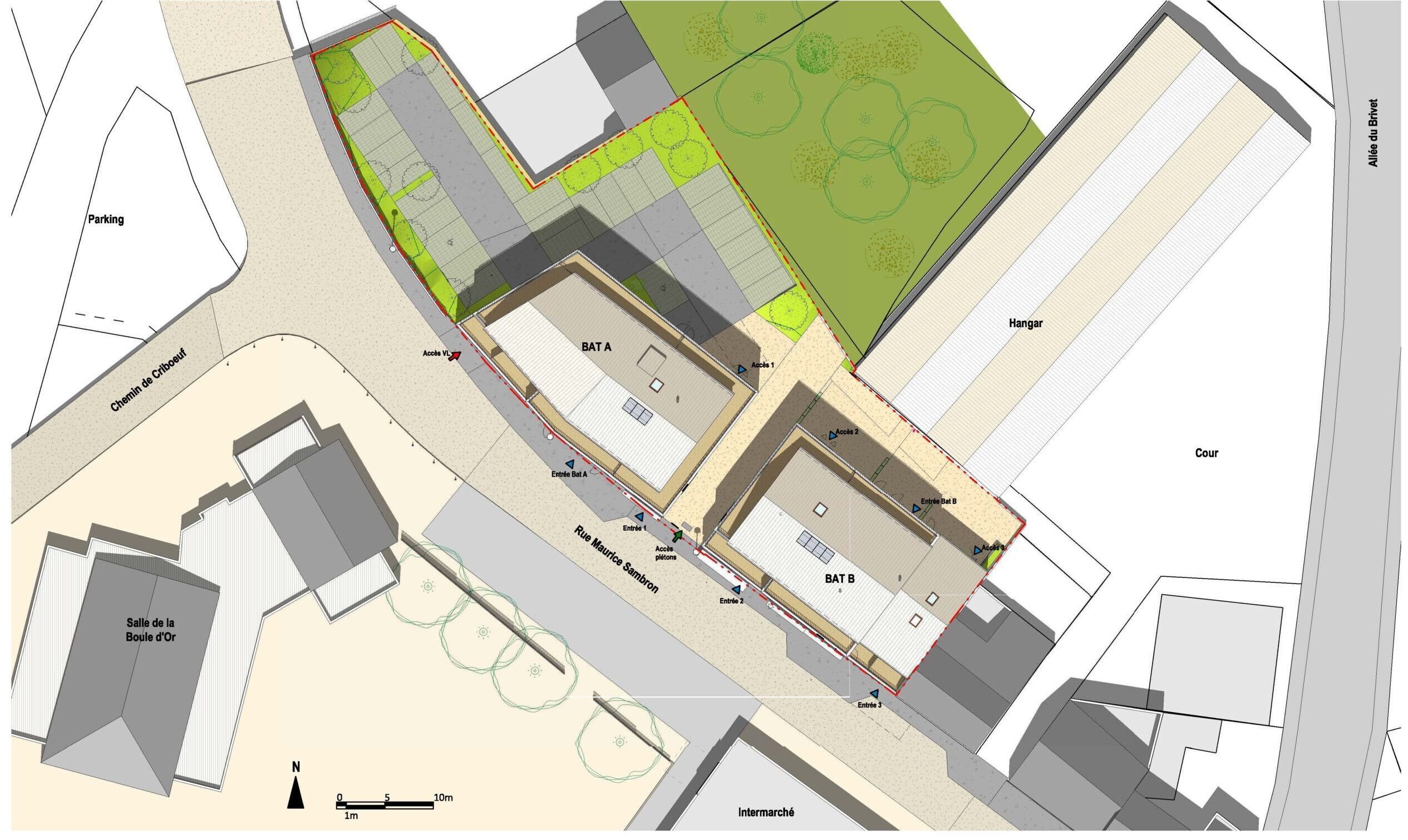 L’ensemble architectural se distingue par une esthétique contemporaine élégante, utilisant des matériaux nobles et durables : bardage bois, teintes naturelles, parements pierre. Cette écriture architecturale, sobre et chaleureuse, s’intègre harmonieusement dans le tissu urbain de Pontchâteau tout en affirmant une vraie identité visuelle.