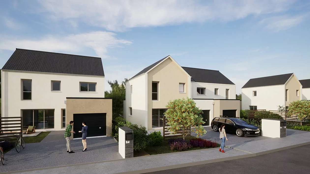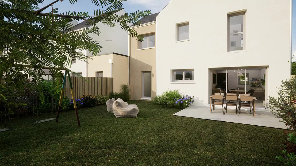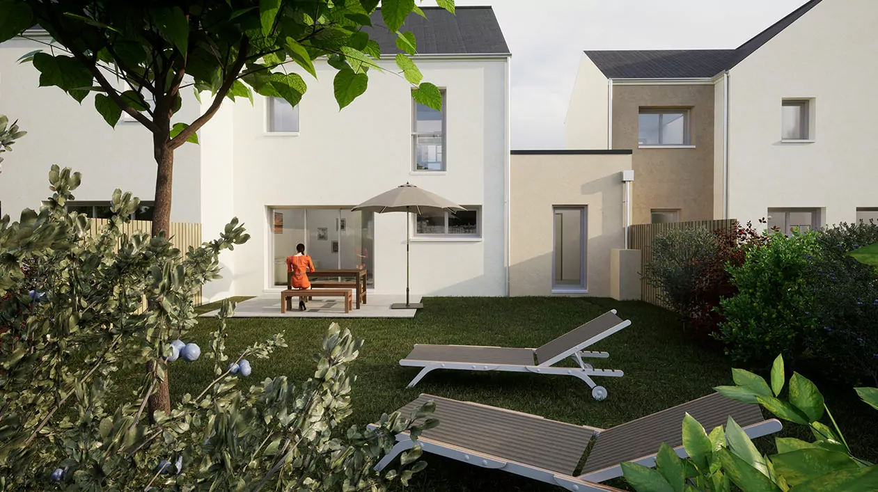 Des percées paysagères donnent de l’importance aux végétaux, facilitant l’intégration du projet au sein de ce contexte naturel de coulée verte, proche du Louet. Ces maisons aux pièces de vie traversantes, aux jardins généreux et possédant de larges ouvertures sur 3 orientations, s’implantent en décalage, libérant des espaces intimes pour chacun.