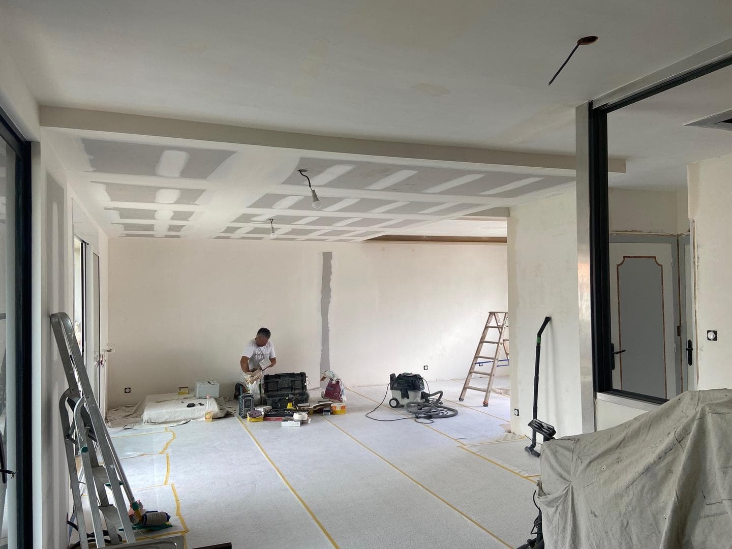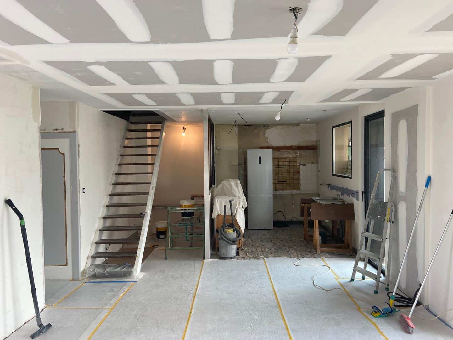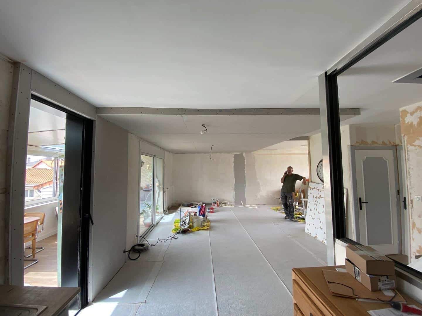 Les travaux de plafonnage et de finition ont également contribué à cette transformation. Le plafond a été rénové pour intégrer un éclairage encastré, créant une ambiance douce et chaleureuse, parfaitement adaptée à la cuisine.