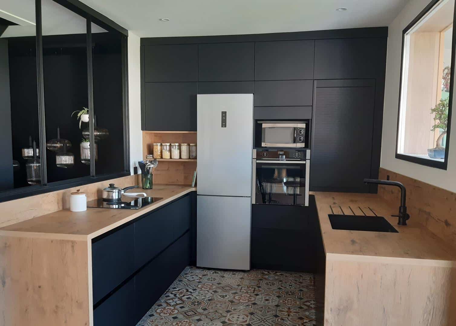 Conserver le sol existant a été un choix stratégique et esthétique qui ancre la pièce dans son histoire, tout en mettant en lumière le savoir-faire de l’artisan ayant réalisé la rénovation. Le sol, par ses motifs uniques, devient un véritable atout dans cet espace rénové, ajoutant une dimension authentique et intemporelle à la modernité de la cuisine.