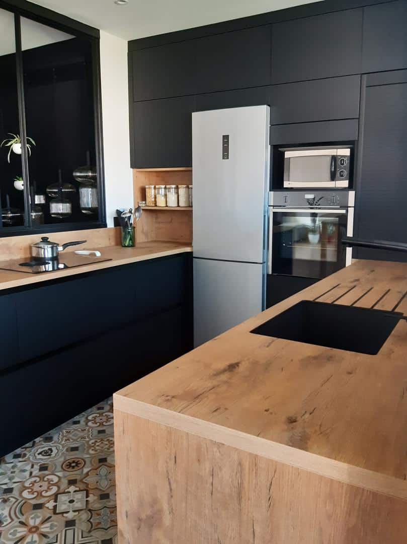L’organisation de la cuisine a été pensée pour offrir un maximum d’efficacité. Les espaces de rangement ont été optimisés et la disposition des appareils électroménagers étudiée pour faciliter chaque geste dans la préparation des repas. Le réfrigérateur, le four encastré et les plaques de cuisson ont tous été installés à portée de main, dans un agencement ergonomique qui permet de gagner du temps. Le plan de travail, en bois clair, s’étend généreusement, offrant à la fois un espace fonctionnel et esthétique, qui s’harmonise avec le sol conservé, créant une continuité visuelle entre l’ancien et le moderne.