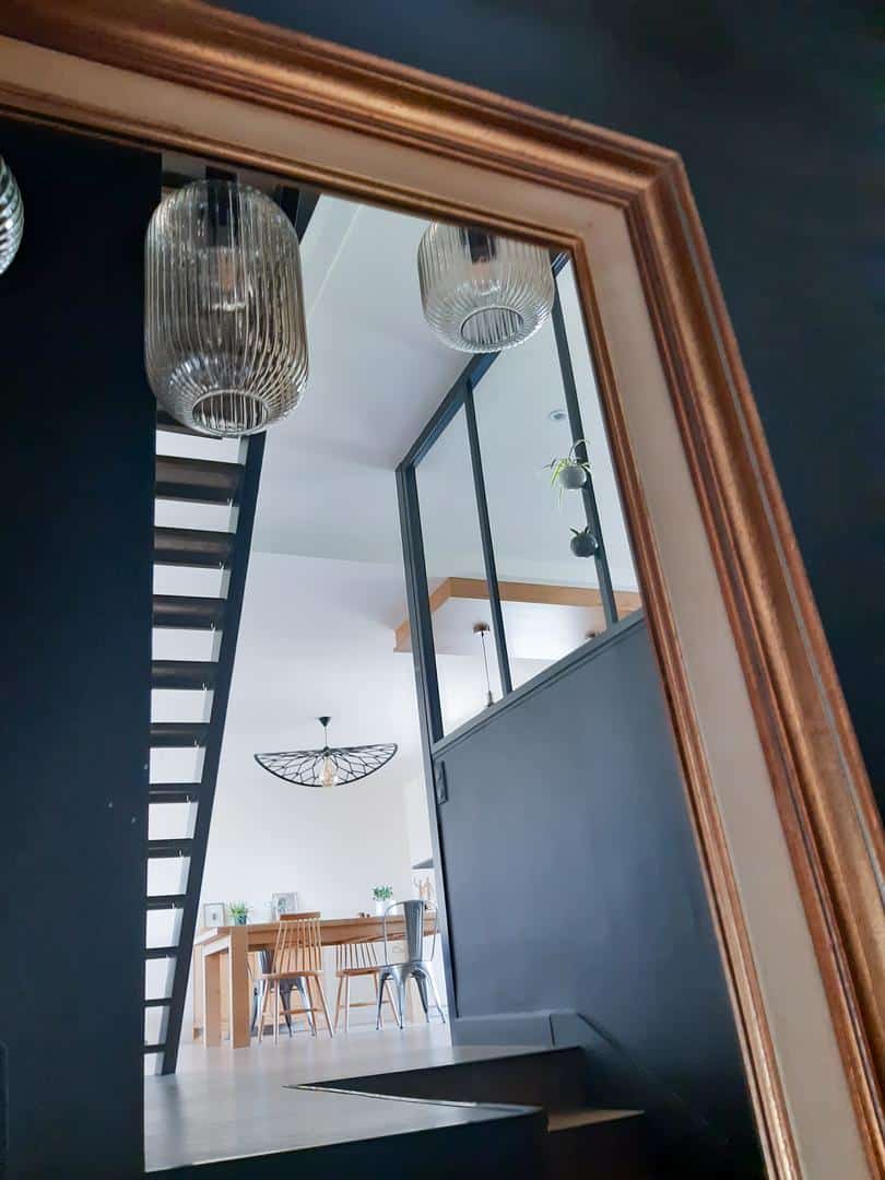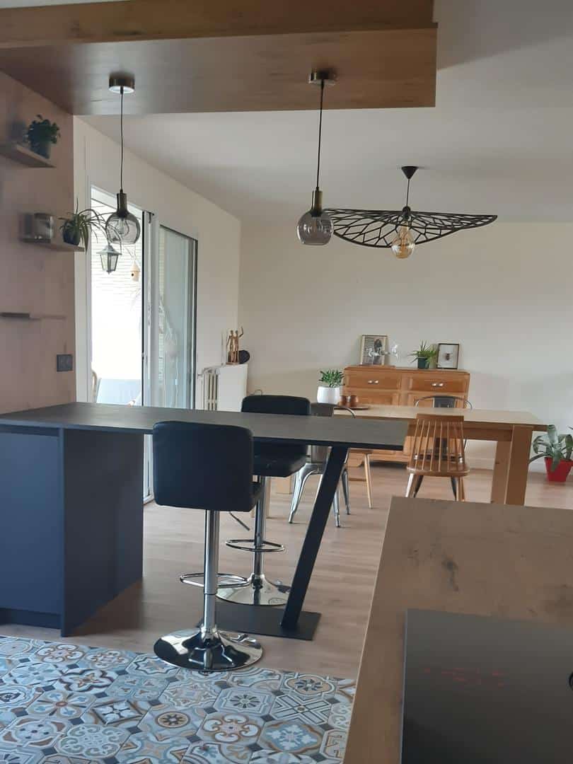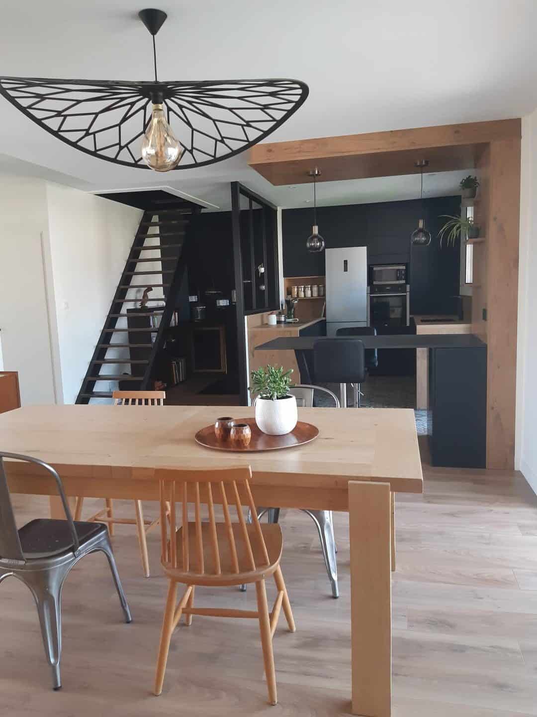 La verrière intérieure, séparant subtilement la cuisine de l’espace de vie, constitue un autre élément marquant de cette rénovation. Elle permet d’apporter de la lumière naturelle tout en délimitant les espaces de manière élégante. Ce choix architectural souligne l’approche contemporaine de la rénovation, en apportant une touche industrielle qui renforce l’identité visuelle de la cuisine. La verrière devient ainsi un point focal, une pièce maîtresse qui offre transparence et style sans sacrifier la fonctionnalité de la cuisine.