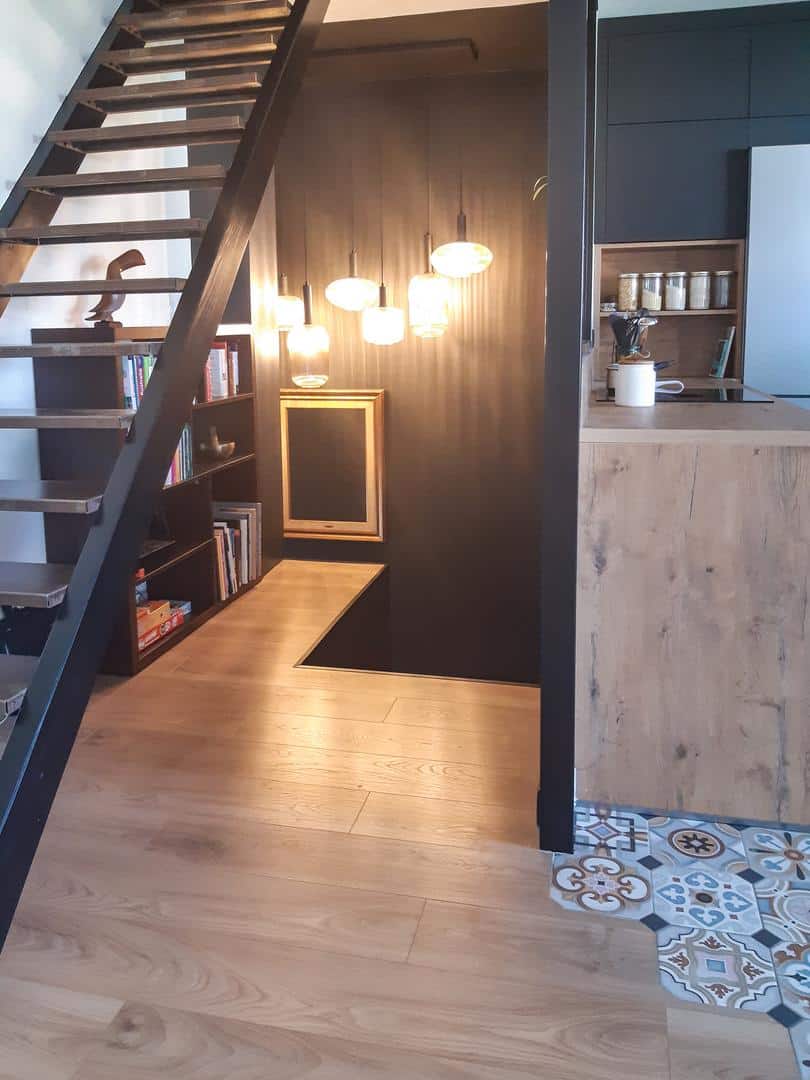 Les travaux ont commencé par la démolition des cloisons et la mise à nu de la pièce de vie. Une ouverture des espaces pour repartir d’une page presque blanche. En effet, la volonté était de conserver le sol existant. Cette envie témoigne d’un choix esthétique fort, visant à préserver le caractère unique du lieu tout en y intégrant des éléments modernes. Ce revêtement de sol, riche en motifs et en textures, apporte une authenticité indéniable qui contraste harmonieusement avec la modernité des nouveaux aménagements.